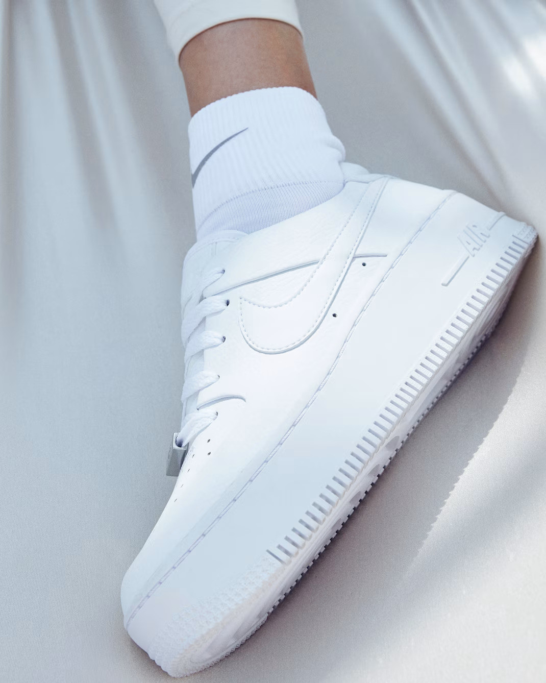 Klasik Air Force 1 köpük orta tabanı, platform görünümü yaratacak şekilde abartılı bir tasarıma sahiptir. Genişletilmiş dış taban dişleri, AF1 tasarımına modern bir yorum katar.