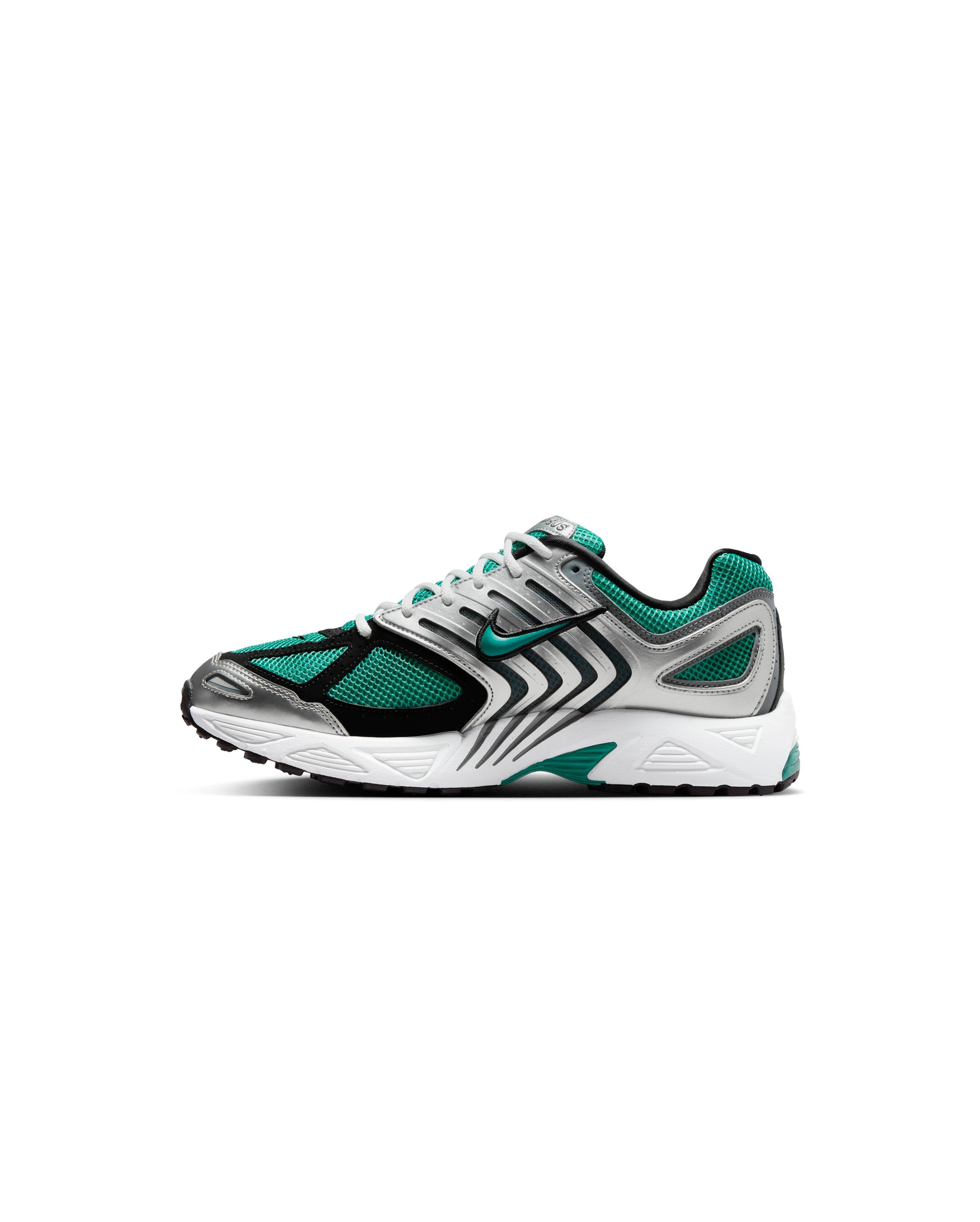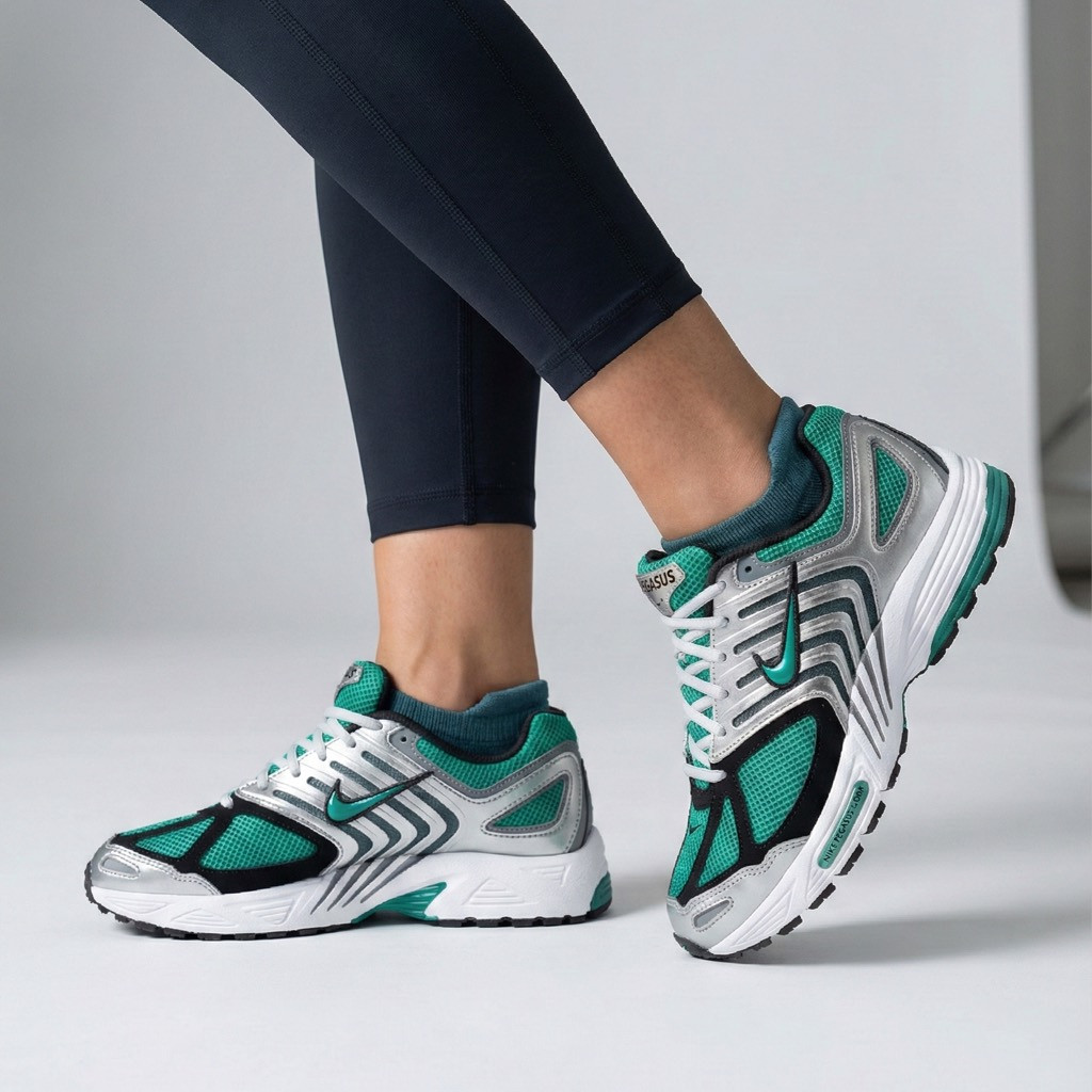 Daha yakından bakıldığında, birinci sınıf yapısını vurgulayan ince detaylar ortaya çıkıyor. Yeşil şeritli siyah Nike Swoosh dikkat çekerken, dil kısmındaki "Air Pegasus" logosu klasik bir dokunuş katıyor. Beyaz orta taban ve siyah dış taban, ayakkabının estetiğini tamamlayarak temiz bir kontrast oluşturuyor.